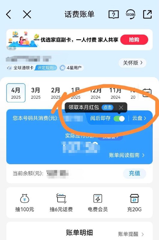 🚦 移动app开启账单阅后存,每月领红包,刚领2元