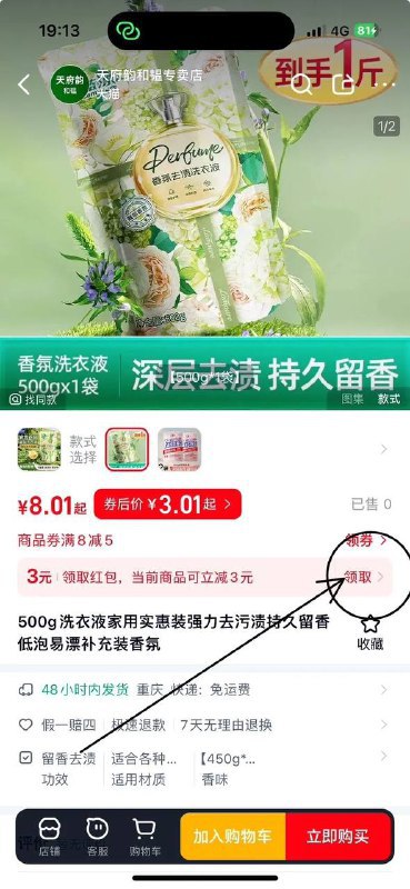 先领取满8减5元优惠券,加入购物车,打开天猫app下单,参与天猫满3元减3元优惠活动,实付低至0.01元