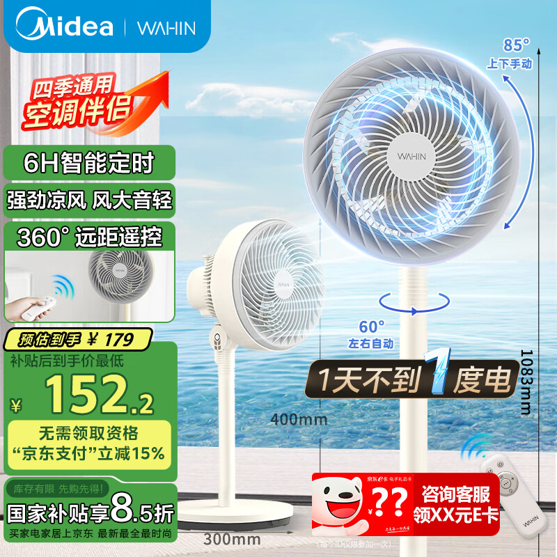 🎒 华凌美的【5叶遥控】空气循环家用落地扇 轻音