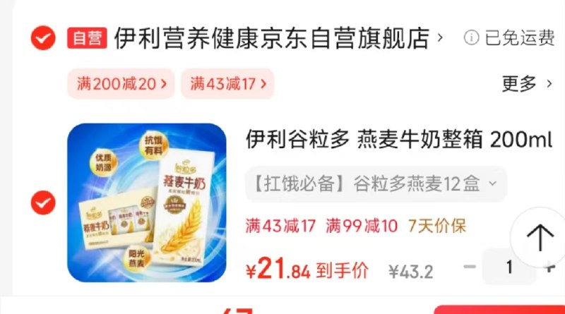 【自营】伊利谷粒多 燕麦牛奶200ml×12盒