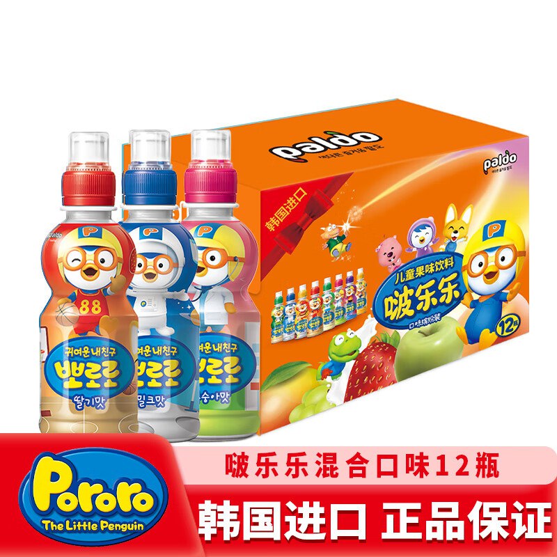 凑199-100后22 啵乐乐pororo 汗国进口混合口味儿童饮料牛奶草莓水蜜桃整箱235ml×12瓶